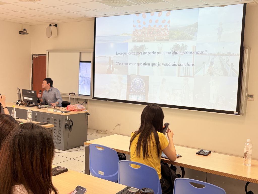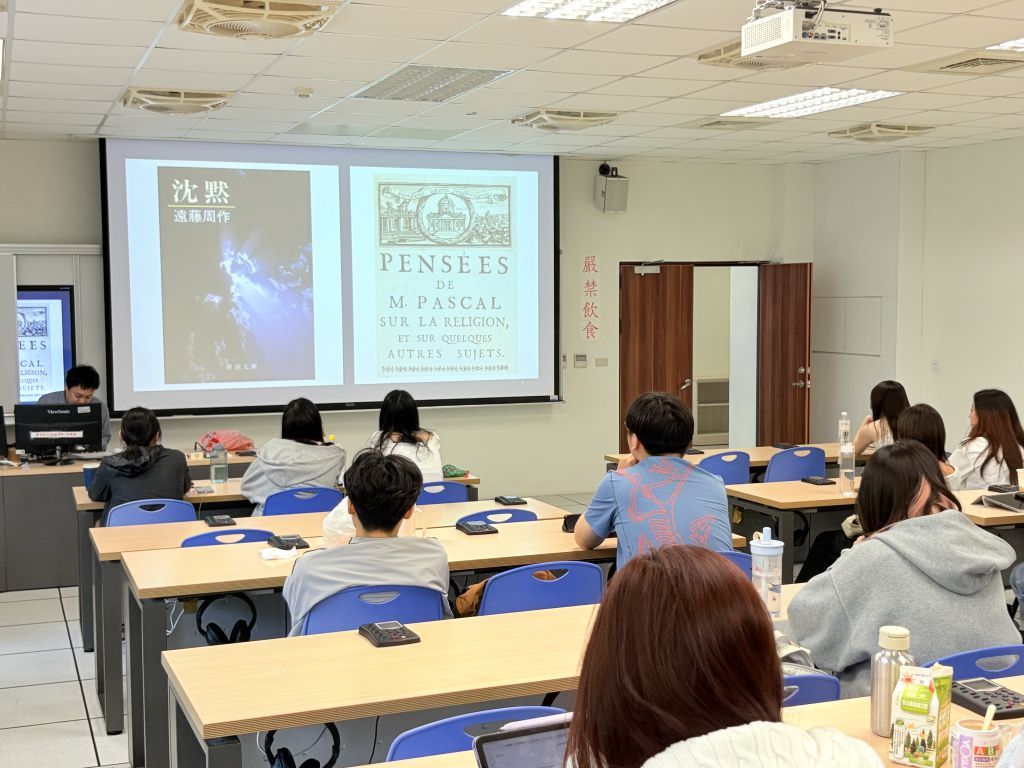 日本盛岡大學副教授鈴木真太朗(Shintaro SUZUKI),以「Du monologue au dialogue : le silence de Dieu entre misère et salut」為題進行專題演講,與本系大三「十七至十八世紀法國文學」課程及大四「法國歷史導論(二)」課程學生交流。