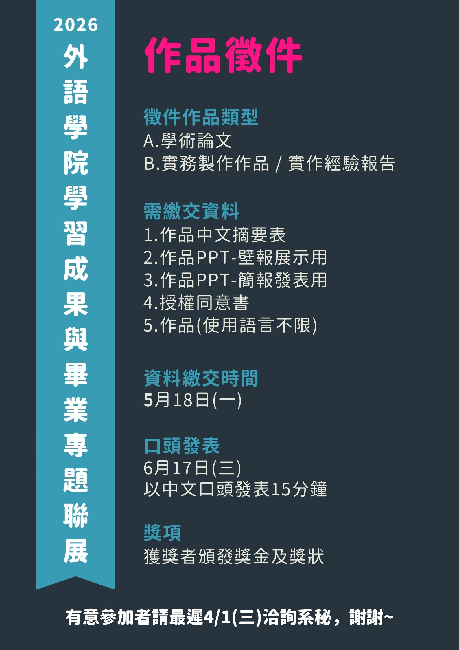 外語學院「2026學習成果與畢業專題聯展-學術論文、實務製作作品/實作經驗報告」徵件公告
